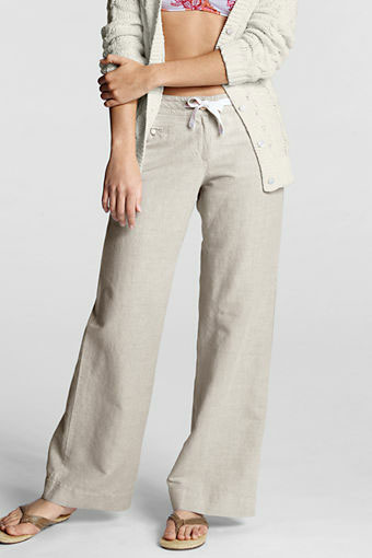 Crisp, light blend of linen and cotton Smooth-fitting contour waist Functional drawstring adjusts the fit Offset side pockets, patch pockets in back Fit 2: Sits slightly below the natural waist, wide legs have a bit of ease in the thigh We'll hem them for free. Everything about them is easy: from wide-leg silhouette to drawstring waist to cool blend of cotton and linen. The overall shape is comfortable and just slightly slouchy (in a most appealing way). So you can wear pants at the height of the summer - and still feel cool doing it. 53% linen/47% cotton.